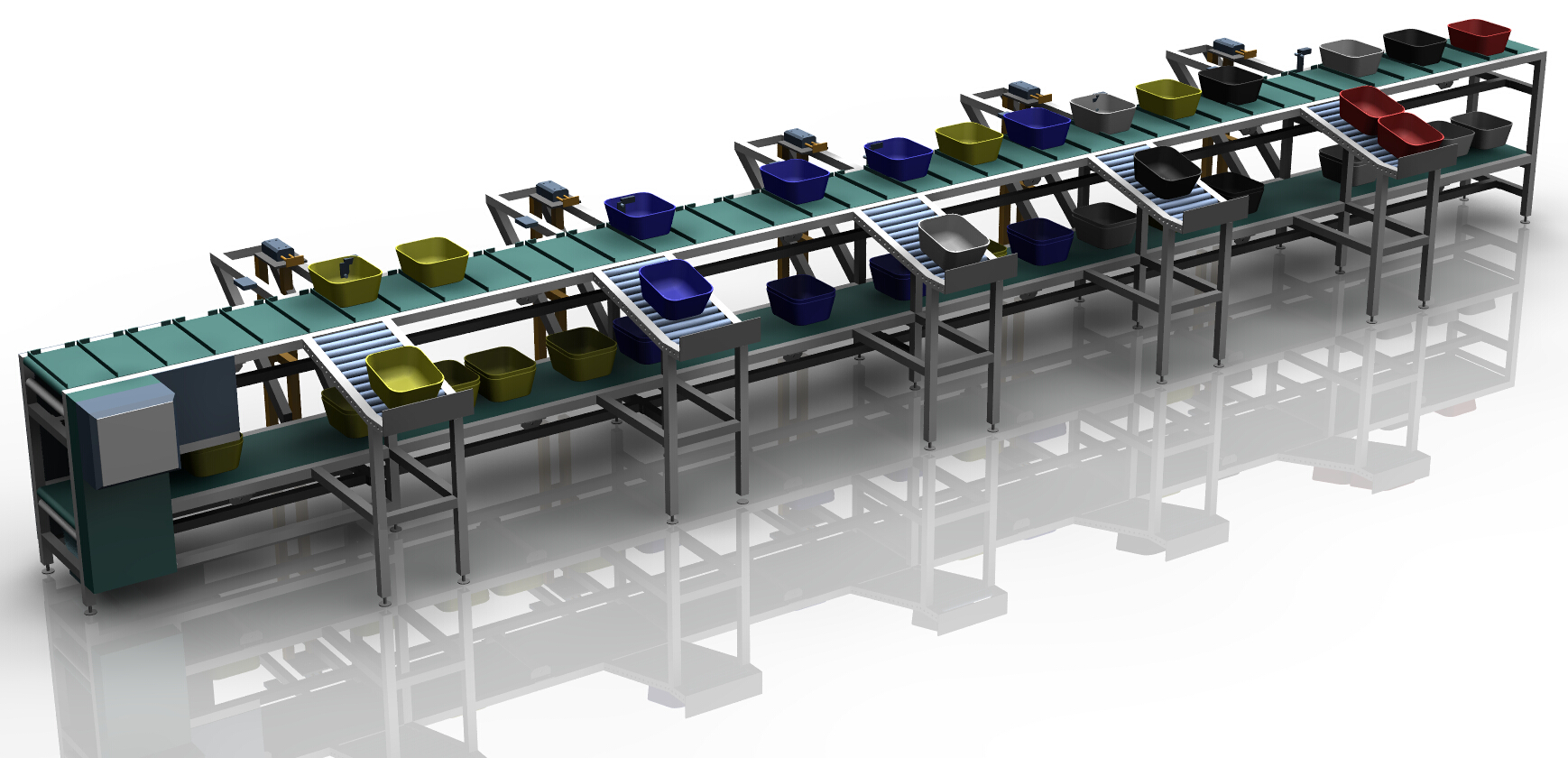 技术要求 此流水线为双层皮带流水线 配备色标感应器 每个色标感应器安装在相应位置当开关生效时相对应的货物就将到达相对应的工位 从而达到自动化效果 下层皮带流向则相反 用来返回物料盆。